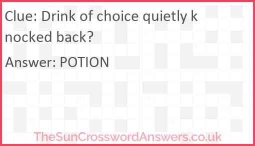 Drink of choice quietly knocked back? is a crossword clue for which we have 1 possible answer and we have spotted 1 times in our database. This crossword clue was last seen on 28 November 2024 in The Sun Cryptic Crossword puzzle!