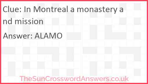 In Montreal a monastery and mission is a crossword clue for which we have 1 possible answer and we have spotted 1 times in our database. This crossword clue was last seen on 08 January 2025 in The Sun Cryptic Crossword puzzle!